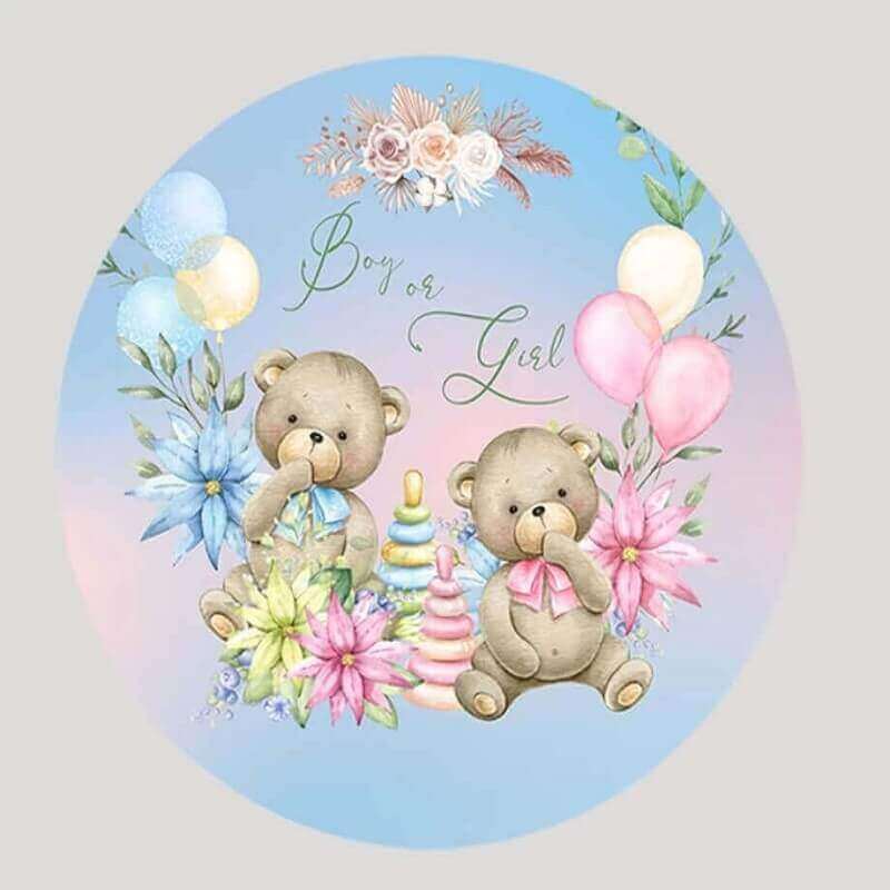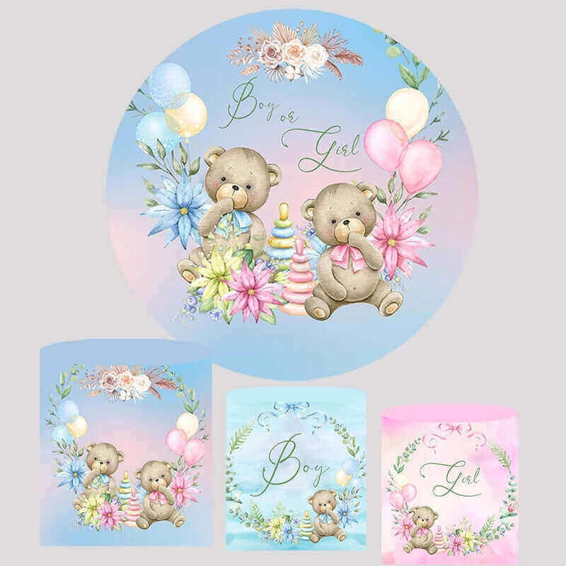 Announce your baby’s gender in the sweetest way with this Watercolor Bear Gender Reveal Round Backdrop and Cylinder Covers set. The design features two adorable bears with pastel balloons, a stack of baby toys, and flowers, set against a soft gradient backdrop.