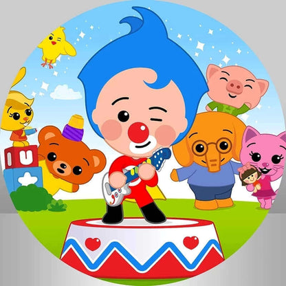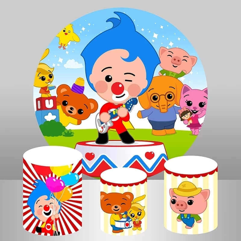 Featuring Plim Plim the clown playing guitar on a circus stage surrounded by his cheerful animal friends, this colorful backdrop sets the tone for an exciting celebration. The set includes three coordinating cylinder covers: one with Plim Plim holding balloons on a red-striped background, one with adorable bear and bunny characters, and one with a pig wearing a yellow hat.