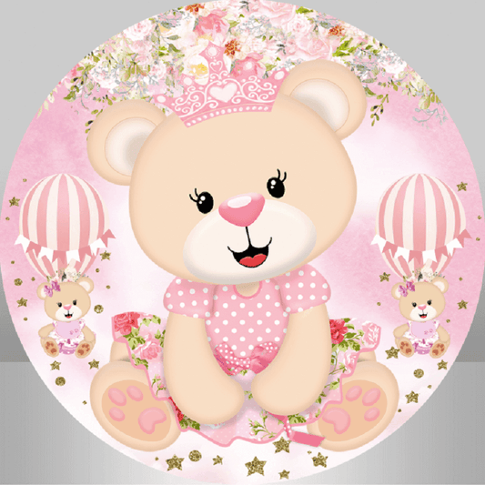 Pink Bear Princess Floral Birthday Party Baby Shower Round Backdrop
