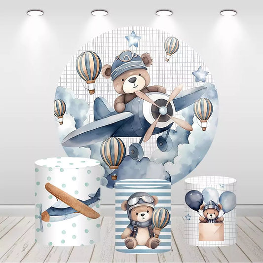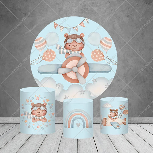 Bear Pilot Kids Birthday Party Photo Studio Circle Round Backdrop Cylinder Covers