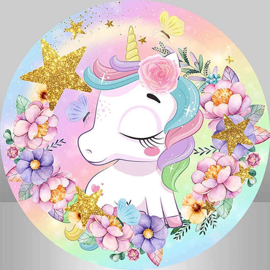 Gold Star Pastel Flowers Baby Unicorn Kids Birthday Round Backdrop