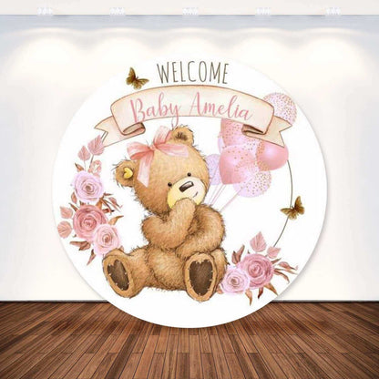Brown Bear Welcome Baby Girls Birthday Party Round Backdrop