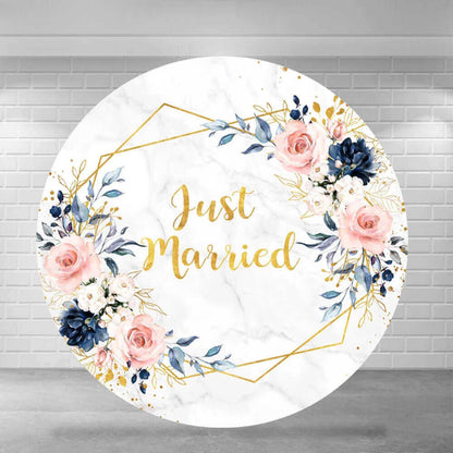 This stunning "Just Married" marble floral round backdrop features soft blush pink roses and elegant navy flowers accented with gold details.